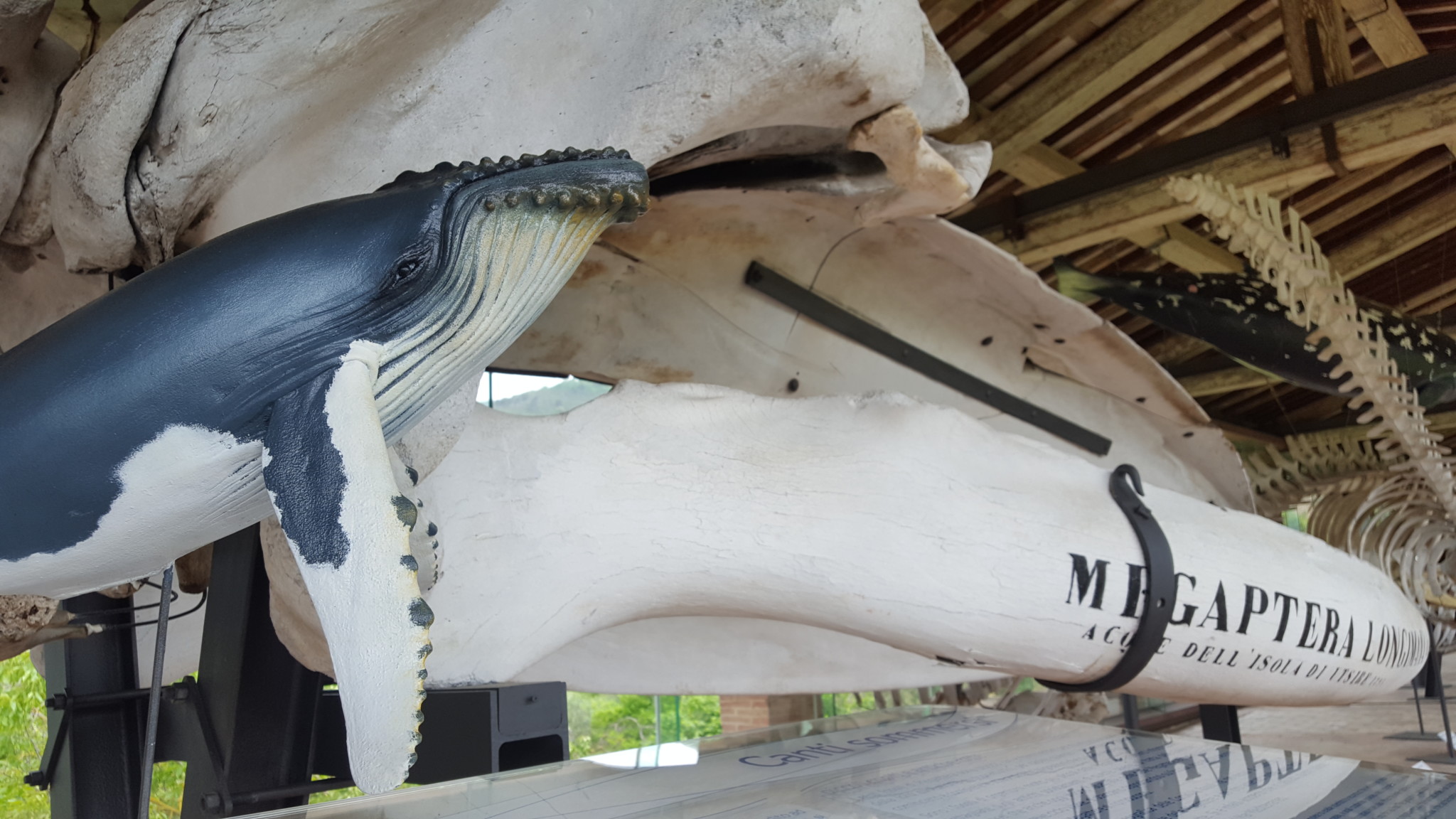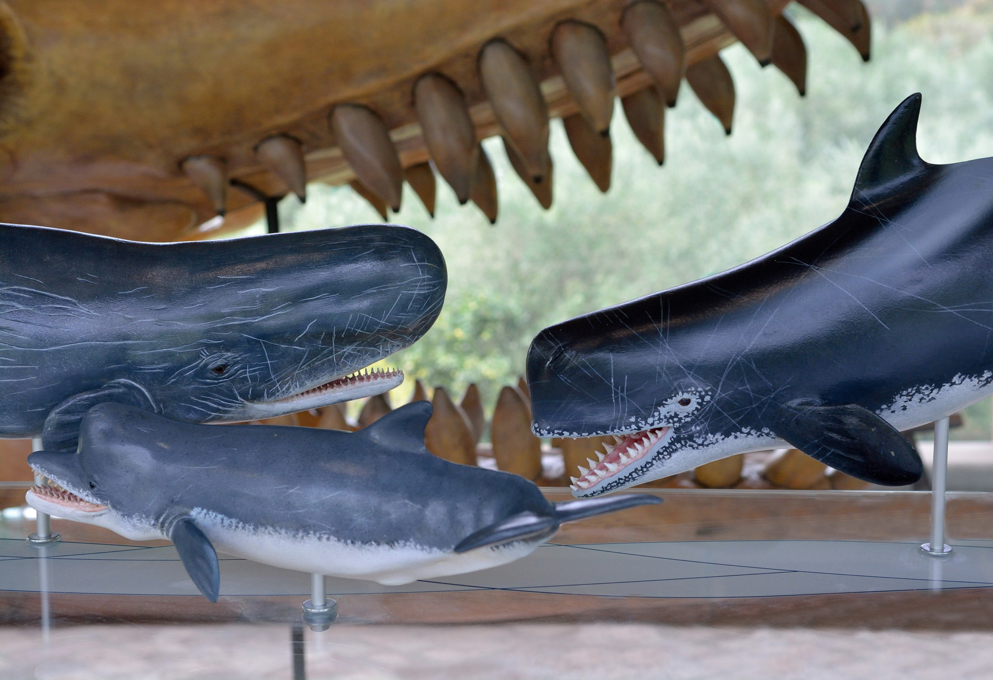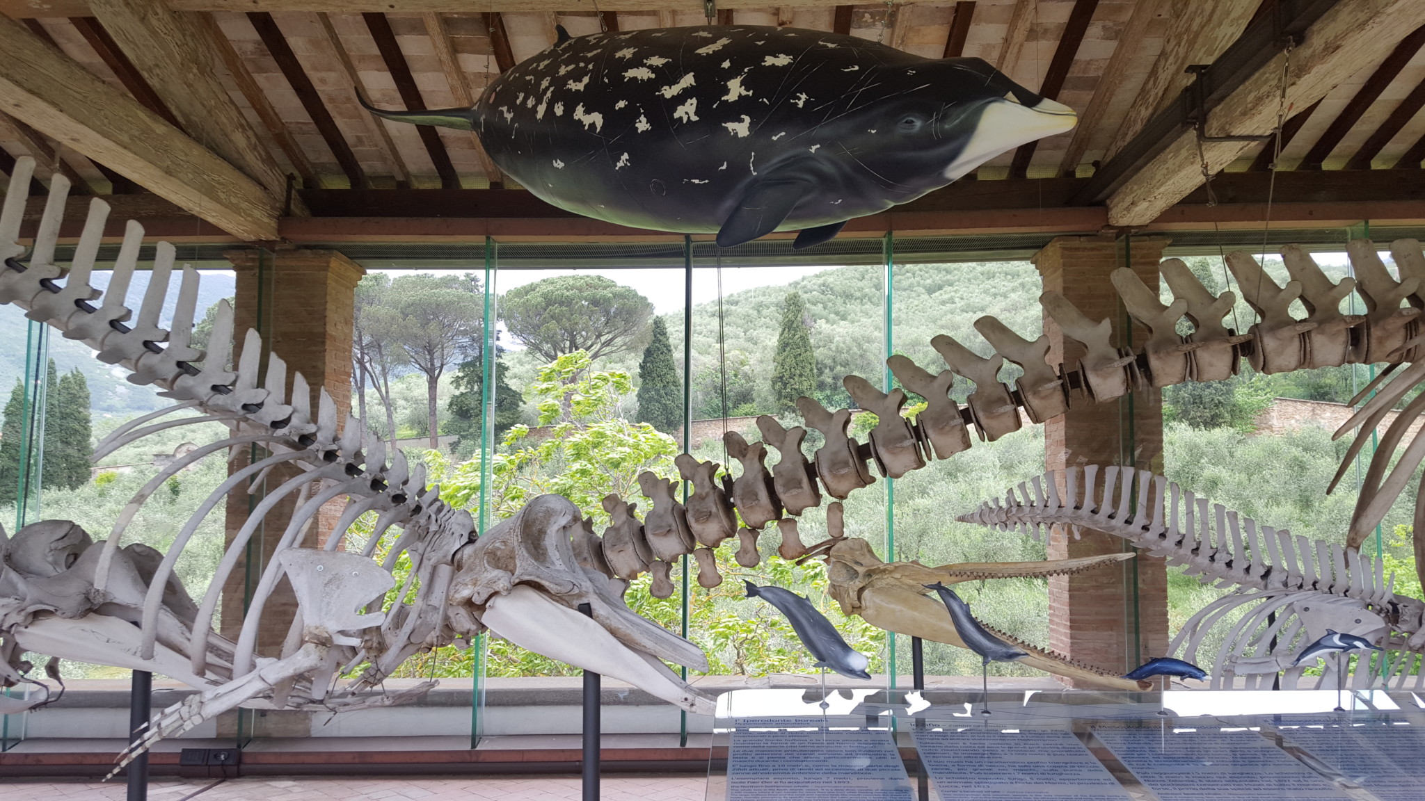 The skeletons of dolphins and whales are flanked by the fossil record of their ancestors in order to facilitate the understanding of the evolution of their structures and behaviors over the time. The most spectacular of the fossil specimens on exhibition (both originals and casts) is certainly the model of the skull of Leviathan (Livyatan melvillei), an ancestor of the Sperm whale with a predatory behavior similar to that of Killer whale. The original skull was discovered in 2008 in Peru, in sediments of about 9 million years ago.
