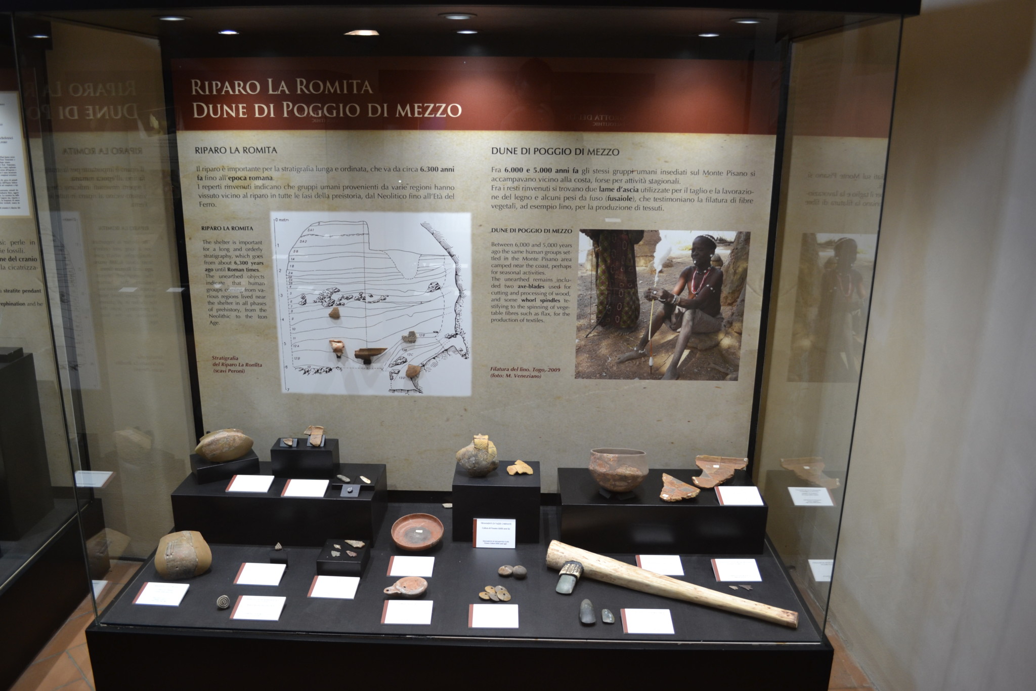 The third showcase is devoted to the Riparo della Romita and to Poggio di Mezzo (Middle Hill, San Rossore, Pisa). The Riparo della Romita consists in an archeological sediment of over 7 meters thickness which represents one of the few complete stratigraphic series of the Tuscany from the ancient Neolithic to the Barbarian Age. Poggio di Mezzo consists in a settlement where have been found ceramics and stone workings of the Neolithic period and ceramics of the Copper Age.