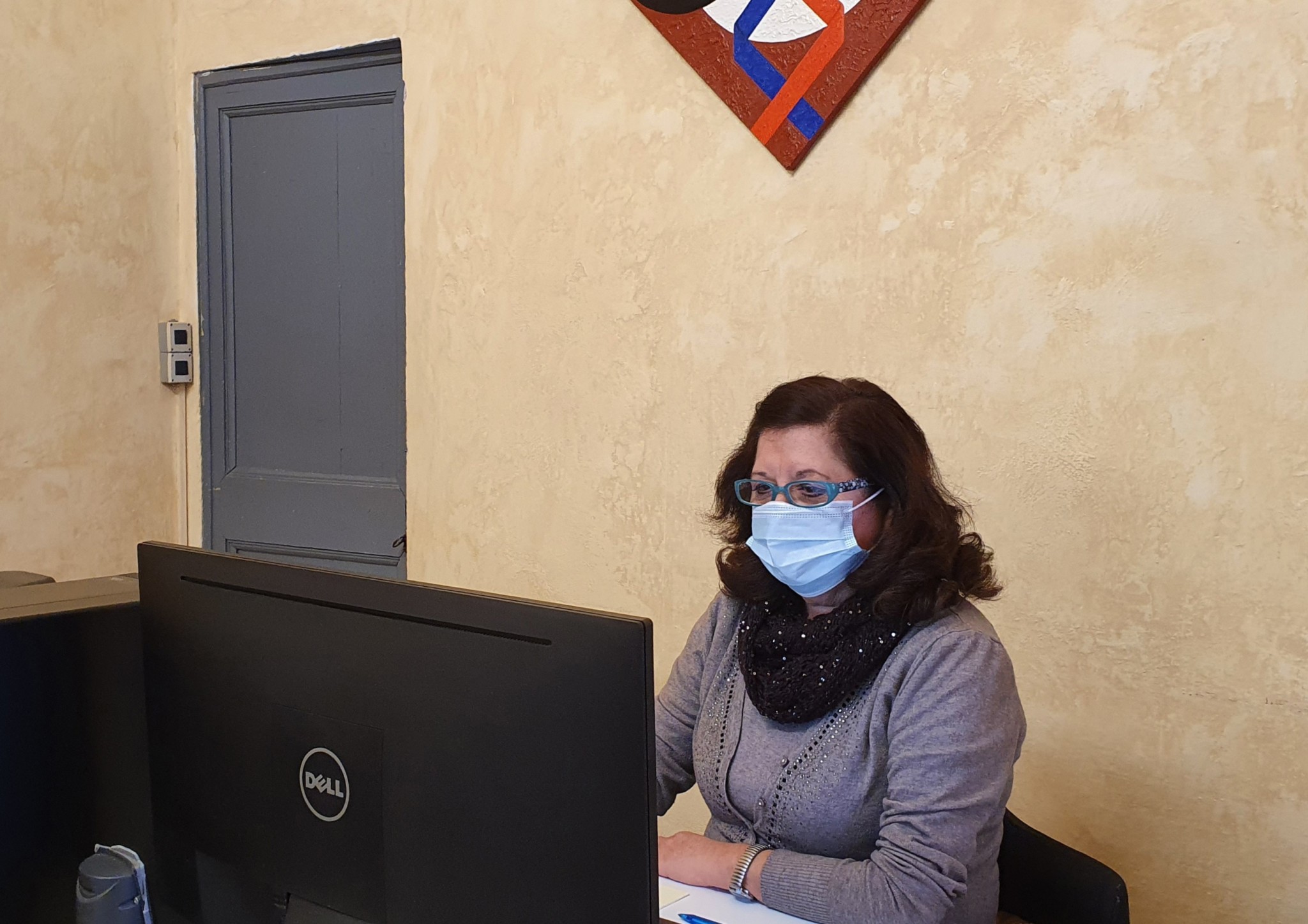 - Rosa Baviello mentre progetta una presentazione delle attività a distanza dedicate agli anziani.