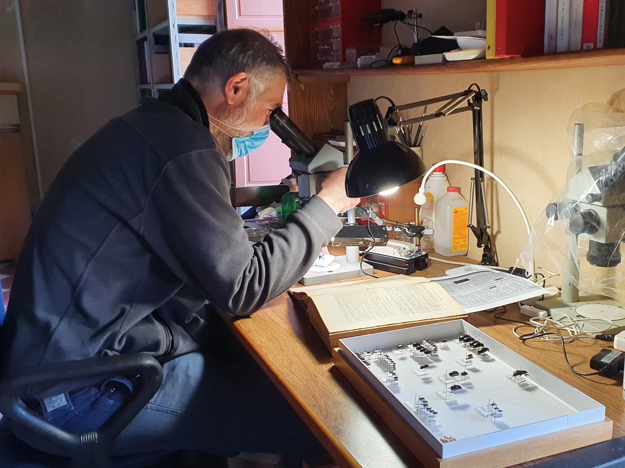 - Marco Dellacasa mentre determina materiale entomologico da inserire in collezione.