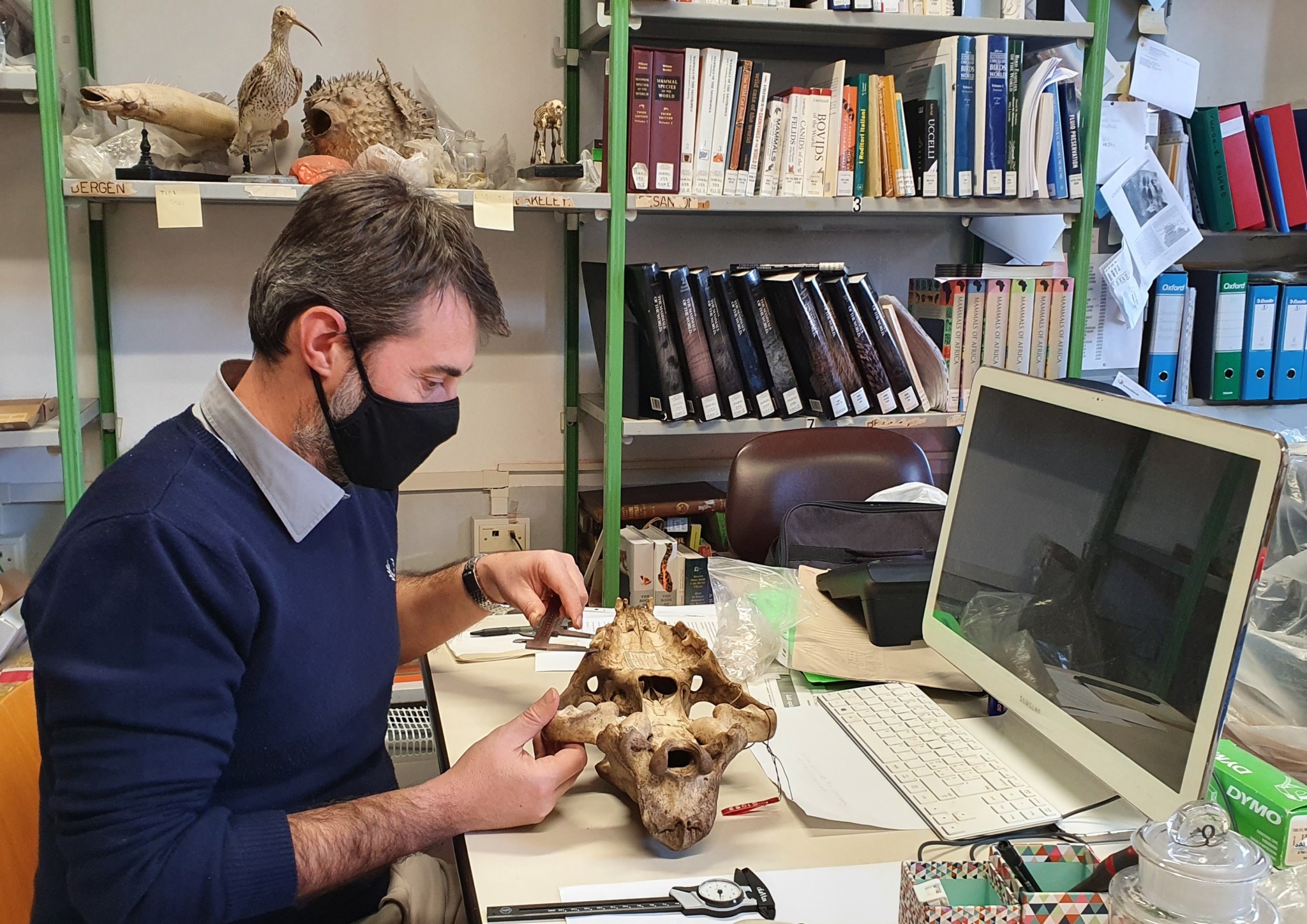 - Simone Farina mentre misura un cranio di leone della collezione storica.