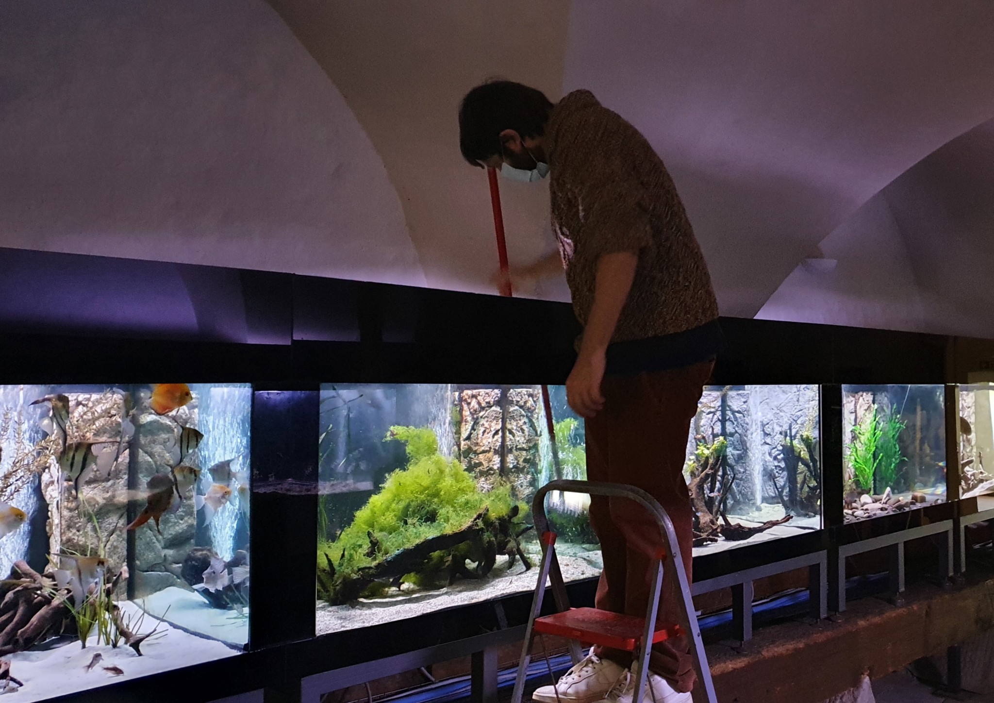 - Alessandro Pancrazzi mentre si occupa della pulizia di una delle vasche dell’acquario.