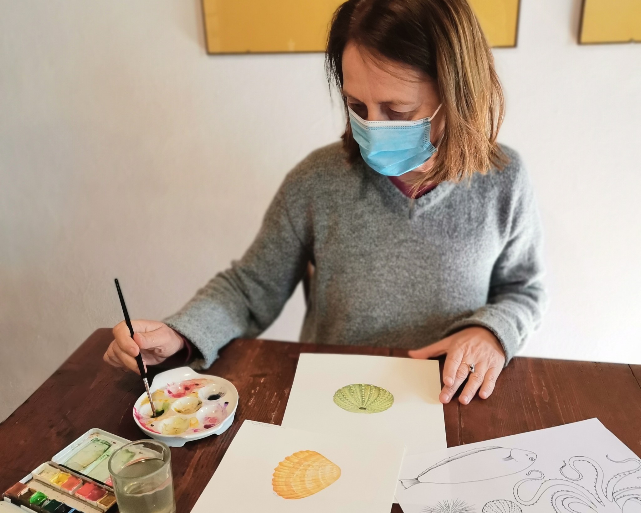- Silvia Battaglini mentre realizza illustrazioni naturalistiche dedicate alla fauna dei nostri mari per un progetto didattico.