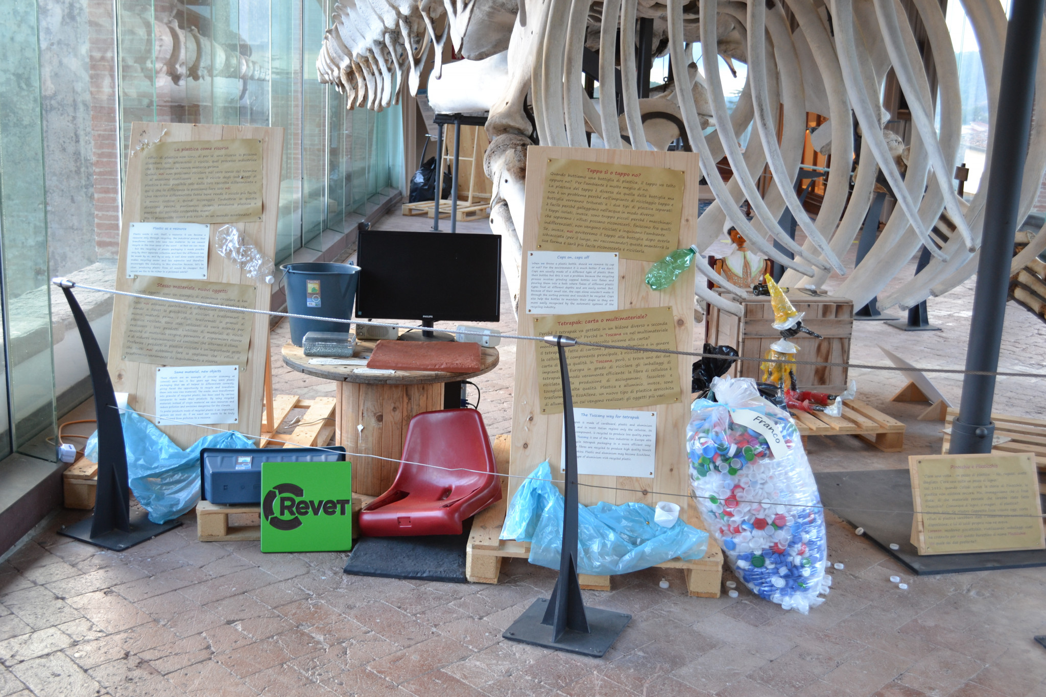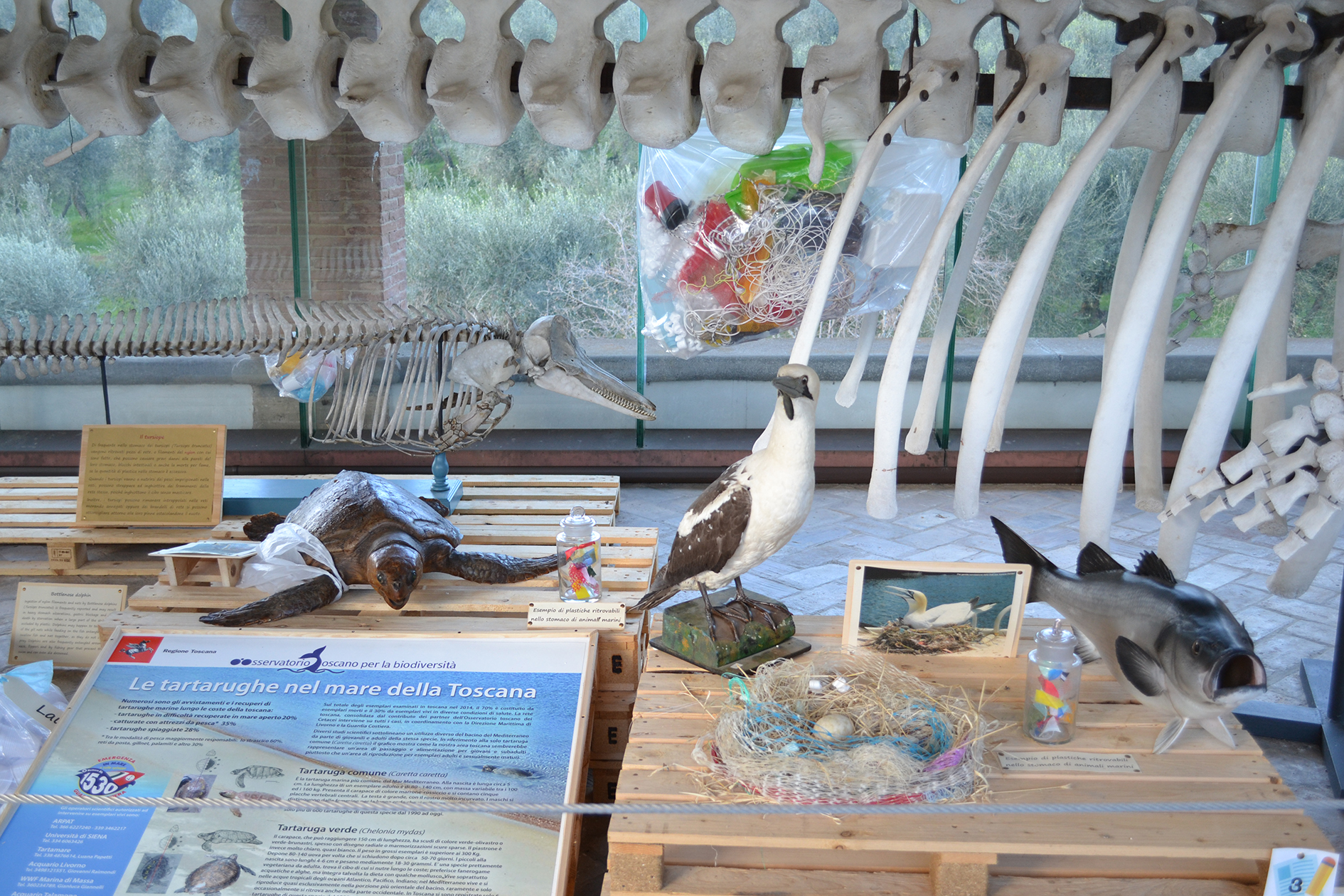 Pensate di essere un abitante del mare e di trovare in casa vostra i rifiuti di qualcun altro. Ogni giorno di più, fino a che la vostra casa non sia diventata una discarica. Vi piacerebbe? Con i rifiuti delle persone che lavorano in Museo, i nostri rifiuti, abbiamo realizzato questo piccolo mare di plastica per mostrarvi l’inquinamento dal punto di vista di un pesce, di una balena, di una tartaruga e di un delfino.