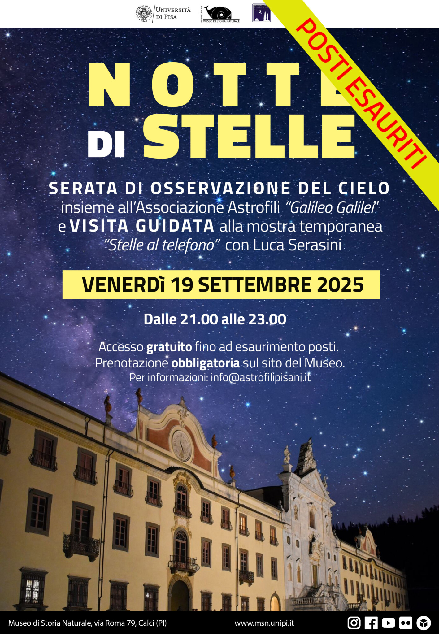 Venerdì 19 settembre 2025, alle ore 21.00, il Museo di Storia Naturale, in collaborazione con l’Associazione Astrofili “Galileo Galilei“, organizza una serata di osservazione astronomica.