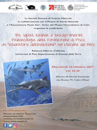Mercoledì 18 ottobre, alle ore 16.30, avrà luogo presso il Museo una conferenza dal titolo Tra squali, balene e bradipi marini. Paleoecologia della Formazione di Pisco, un “laboratorio dell’evoluzione” nel Miocene del Perù, a cura del dott. Alberto Collareta (Università di Pisa, Dipartimento di Scienze della Terra).