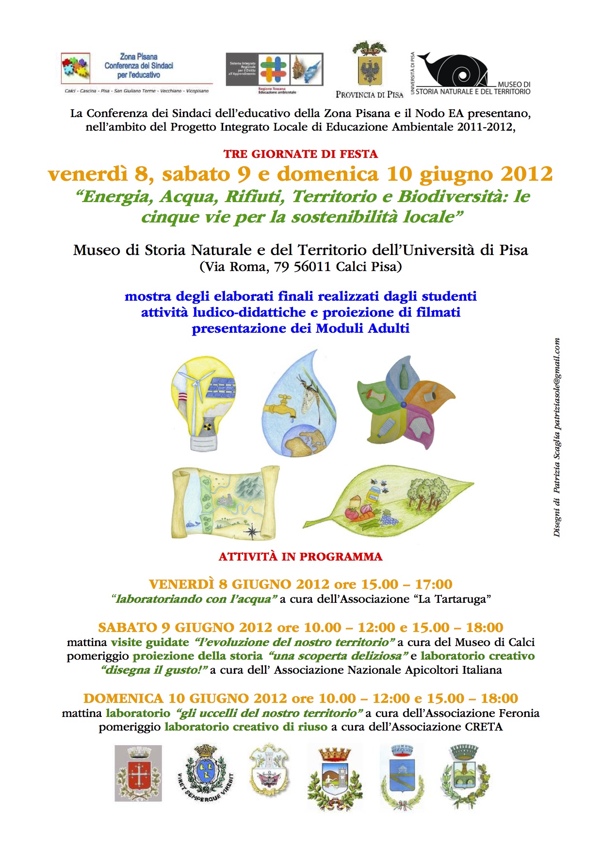 Il programma è il seguente: venerdì 8 giugno 2012 dalle 15,00 alle 17,00 “laboratoriando con l’acqua” a cura dell’associazione La Tartaruga; sabato 9 giugno 2012 dalle 10,00 alle 12,00 visita guidata “L’evoluzione del nostro territorio” a cura del Museo di Calci, dalle 15,00 alle 18,00 proiezione della storia “Una scoperta deliziosa” a cura dell’ associazione Nazionale Apicoltori Italiana; domenica 10 giugno 2012 dalle 10,00 alle 12,00 laboratorio “Gli uccelli del nostro territorio” a cura dell’associazione Feronia e dalle 15,00 alle 18,00 laboratorio creativo di riuso a cura dell’associazione Creta.