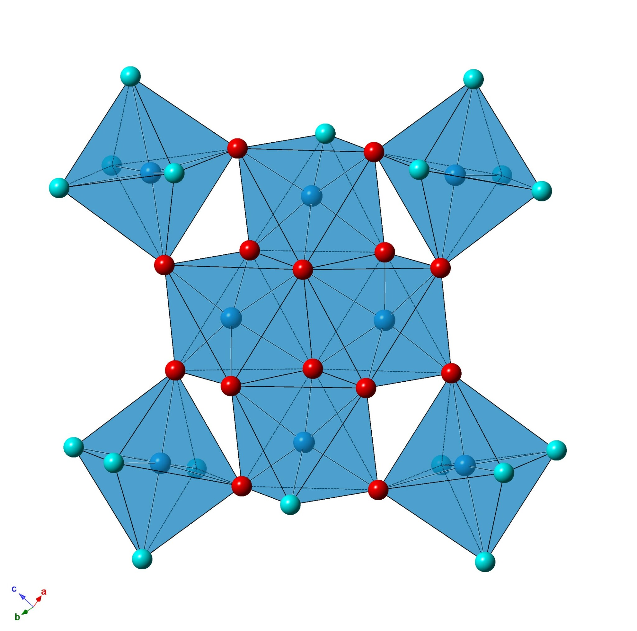 In azzurro il gruppo di ottaedri centrati dall’alluminio. In rosso e in celeste sono rappresentati, rispettivamente, i gruppi (OH) e (H2O). Questo è l’elemento strutturale caratterizzante della batoniite ovvero il poli-oxo-catione [Al8(OH)14(H2O)18]10+.
