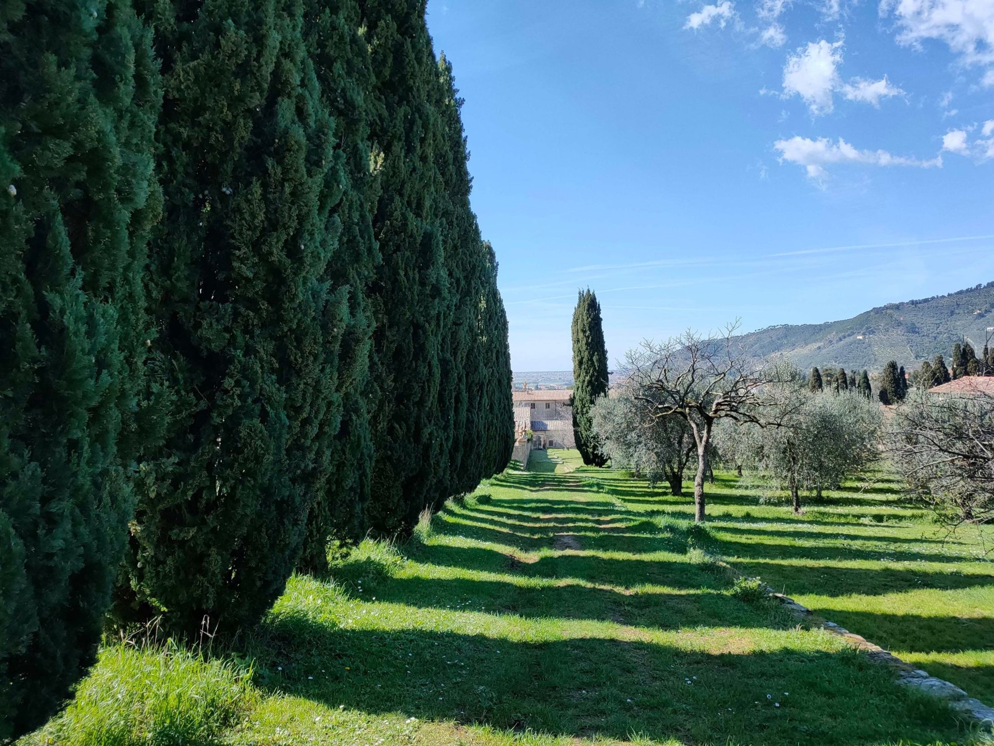 L’altra zona, invece, era definita desertum, per rievocare il deserto della regione dell’antico Egitto, la Tebaide, in cui San Pacomio fondò, intorno al 320 il primo monastero. Il desertum comprende ancora oggi una vasta area prativa in cui sono inseriti circa quattrocento ulivi, un centinaio di alberi da frutto, varie viti a pergola e un campo di lavanda di recente introduzione. Inoltre, nella parte alta, sono preservati vari elementi boschivi, tra cui querce, olmi e aceri. Restano anche alcuni pini domestici, tigli, allori e cipressi, classici elementi impiegati per delimitare i viali e incorniciare i settori.